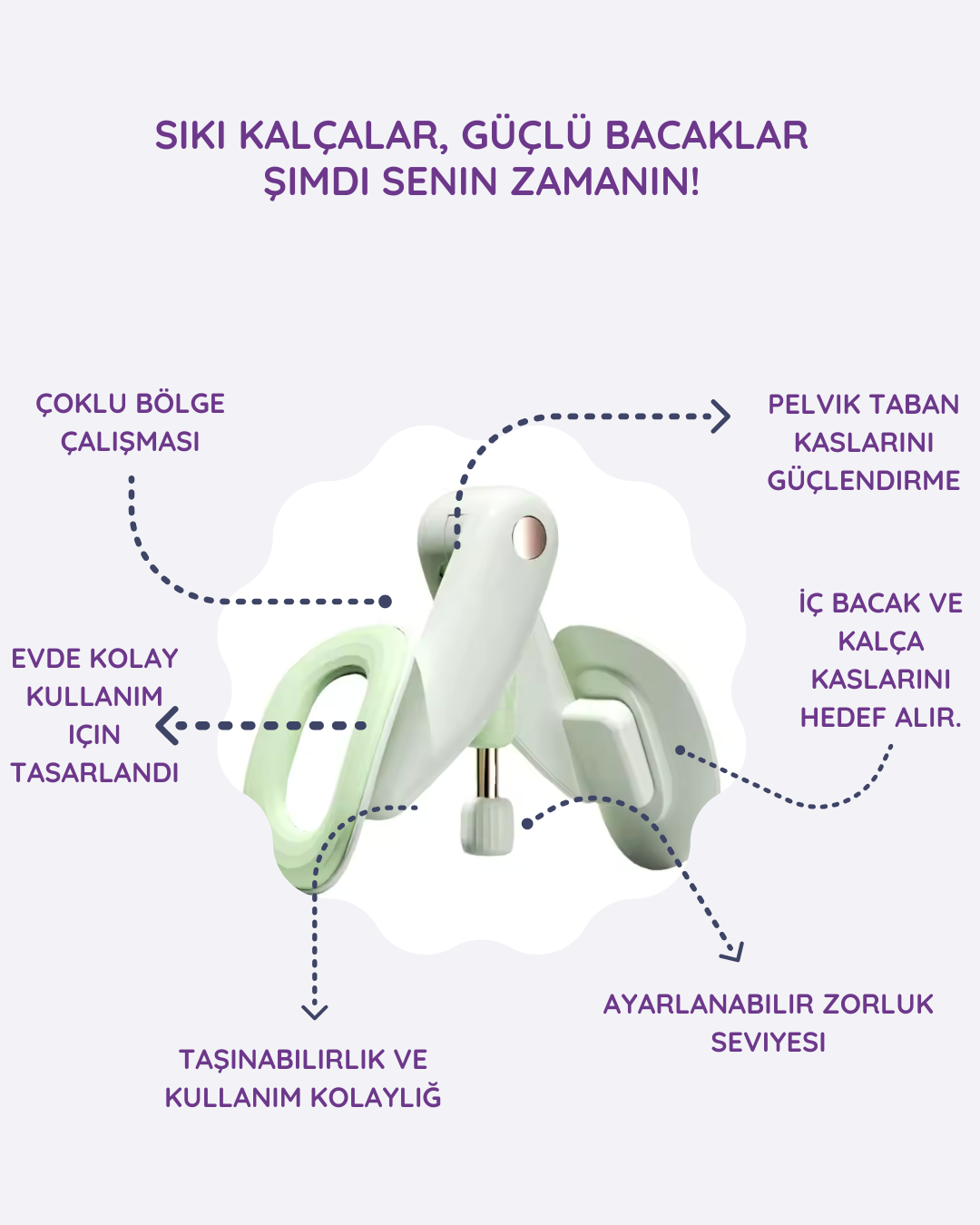 QUELA, özellikle kalça ve iç bacak kaslarını hedef alarak sıkılaşma ve güçlenme sağlar. Ergonomik tasarımı sayesinde kullanımı son derece kolaydır.